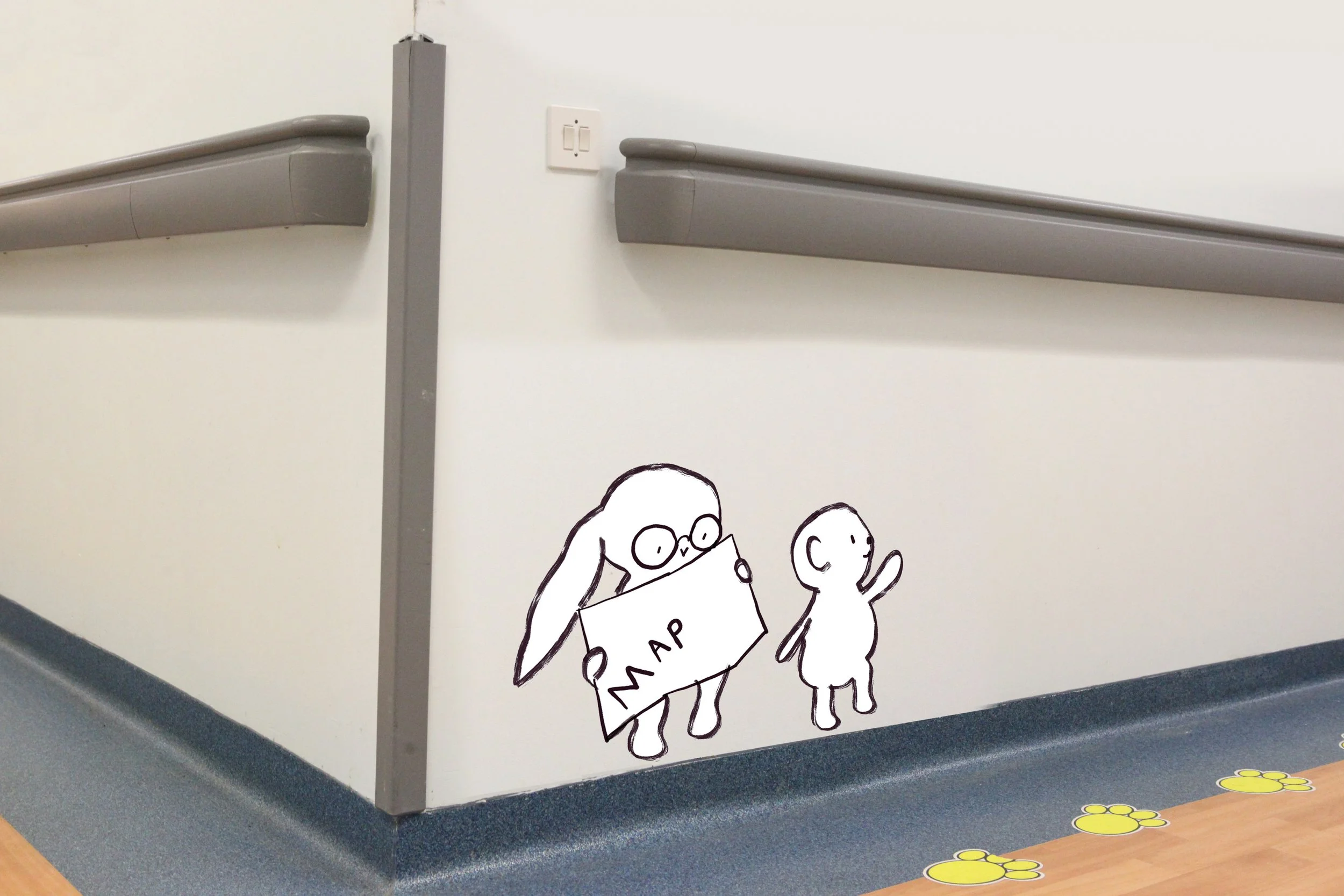 Characters Isla the bunny and Ivor the Bear, shown in their proposed location at Oxford Eye Hospital. Isla is looking at a map, and Ivor seems to be pointing the way forward