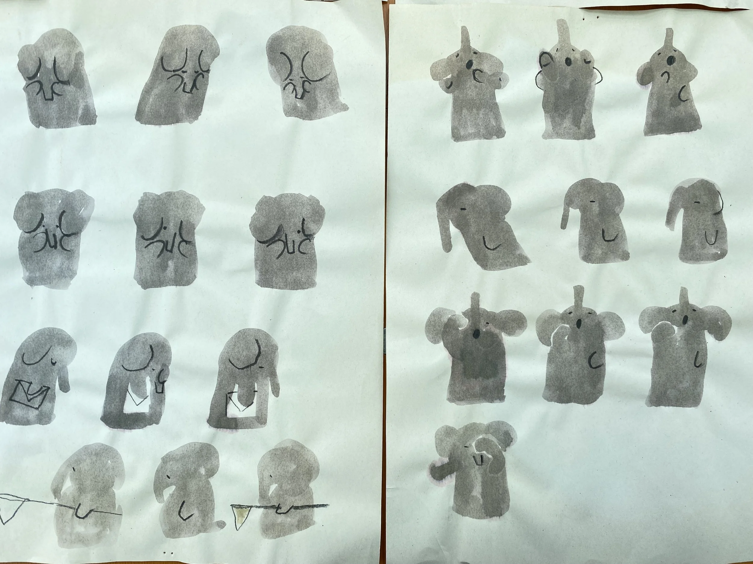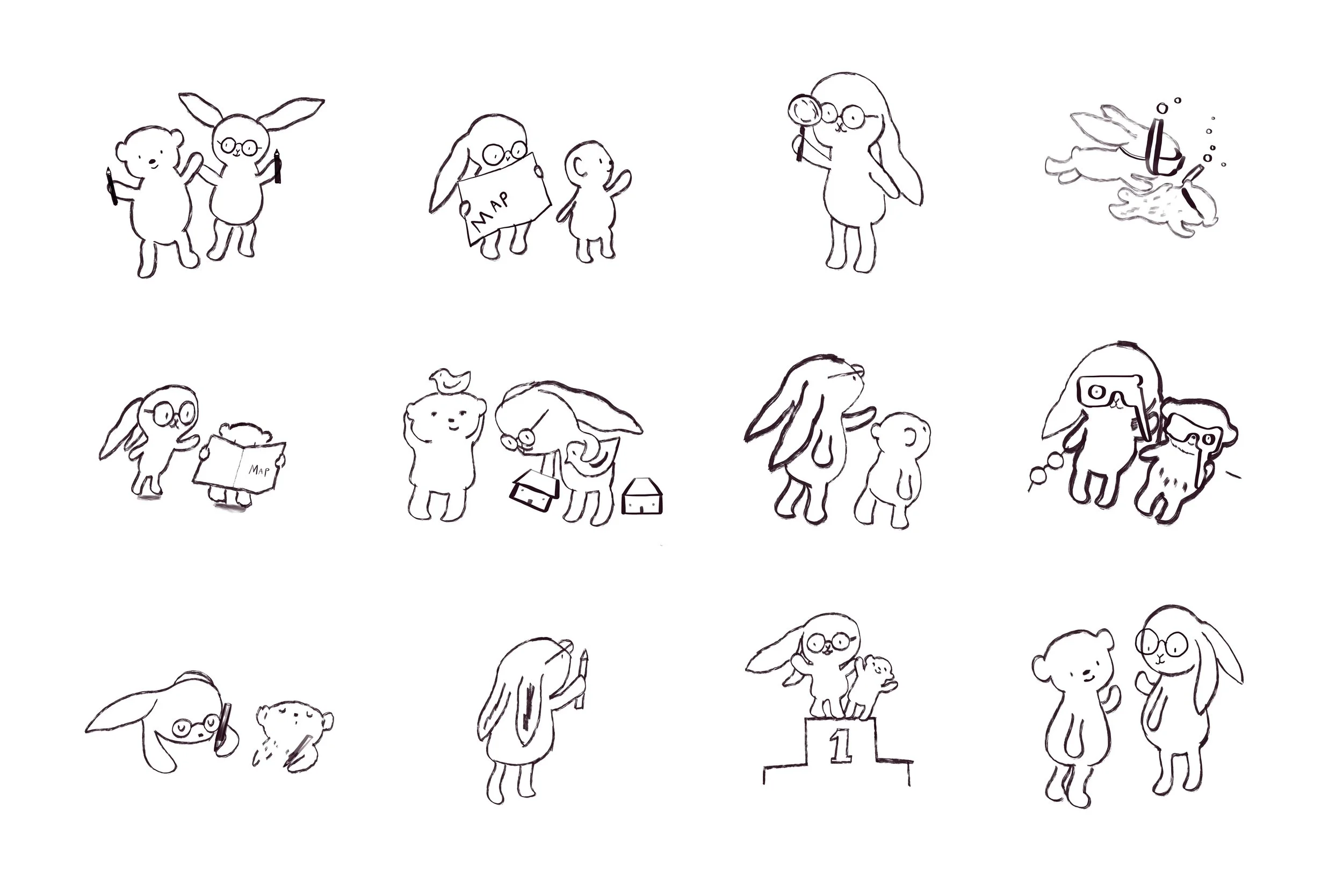 Characters Ivor the Bear and Isla the Bunny in various situations; looking at a map, scuba diving, drawing, standing on a podium or playing with blocks. All drawn by hand by Sarah Lacey