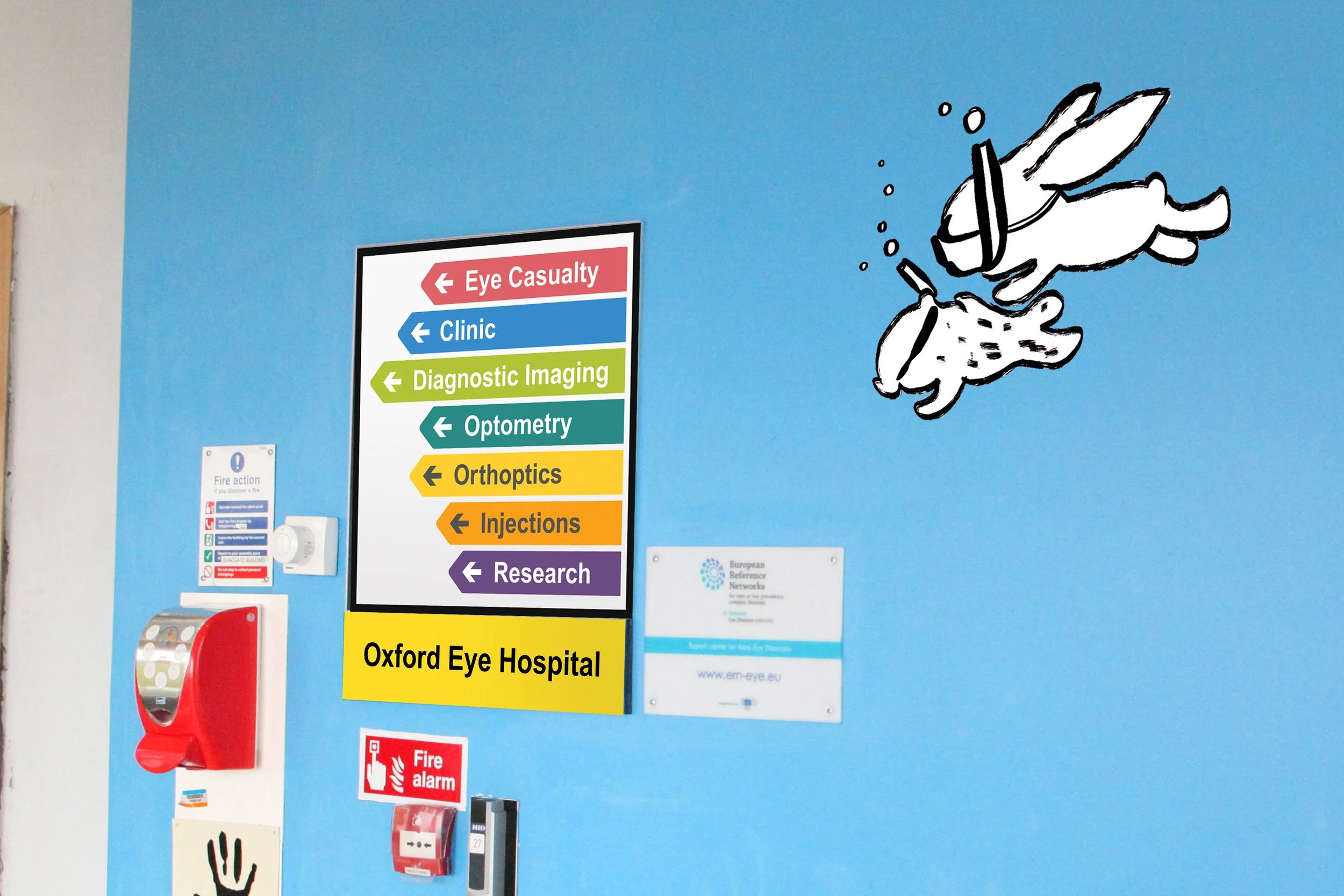 Two animal characters created by Sarah Lacey Isla the rabbit and Ivor the bear, shown in their proposed location at Oxford Eye hospital. They are scuba diving, swimming along a blue wall